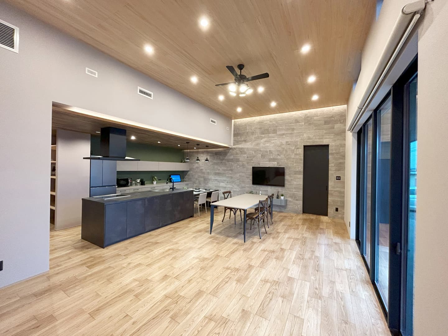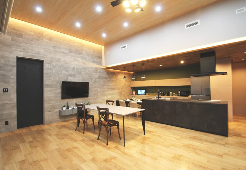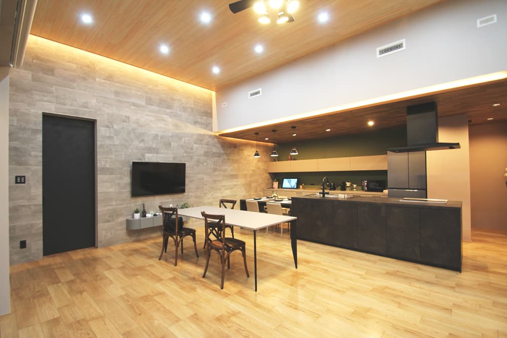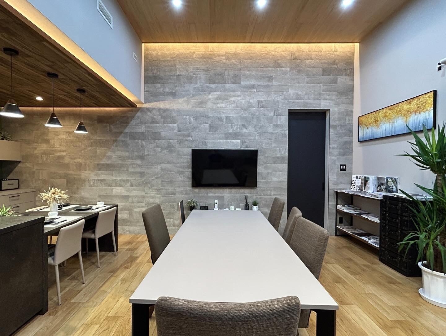 都城モデルハウスのリビングは吹抜けを利用し、天井の高さが3.5mとなっております。吹抜けのメリットは空間を広く魅せることができる他、お部屋に光が入りやすくなるなど様々です。”リビングは家族が一番集まる場所”とされているので設計やデザインにこだわっています。また、お客様とのプランニングもこのリビングで行っております。