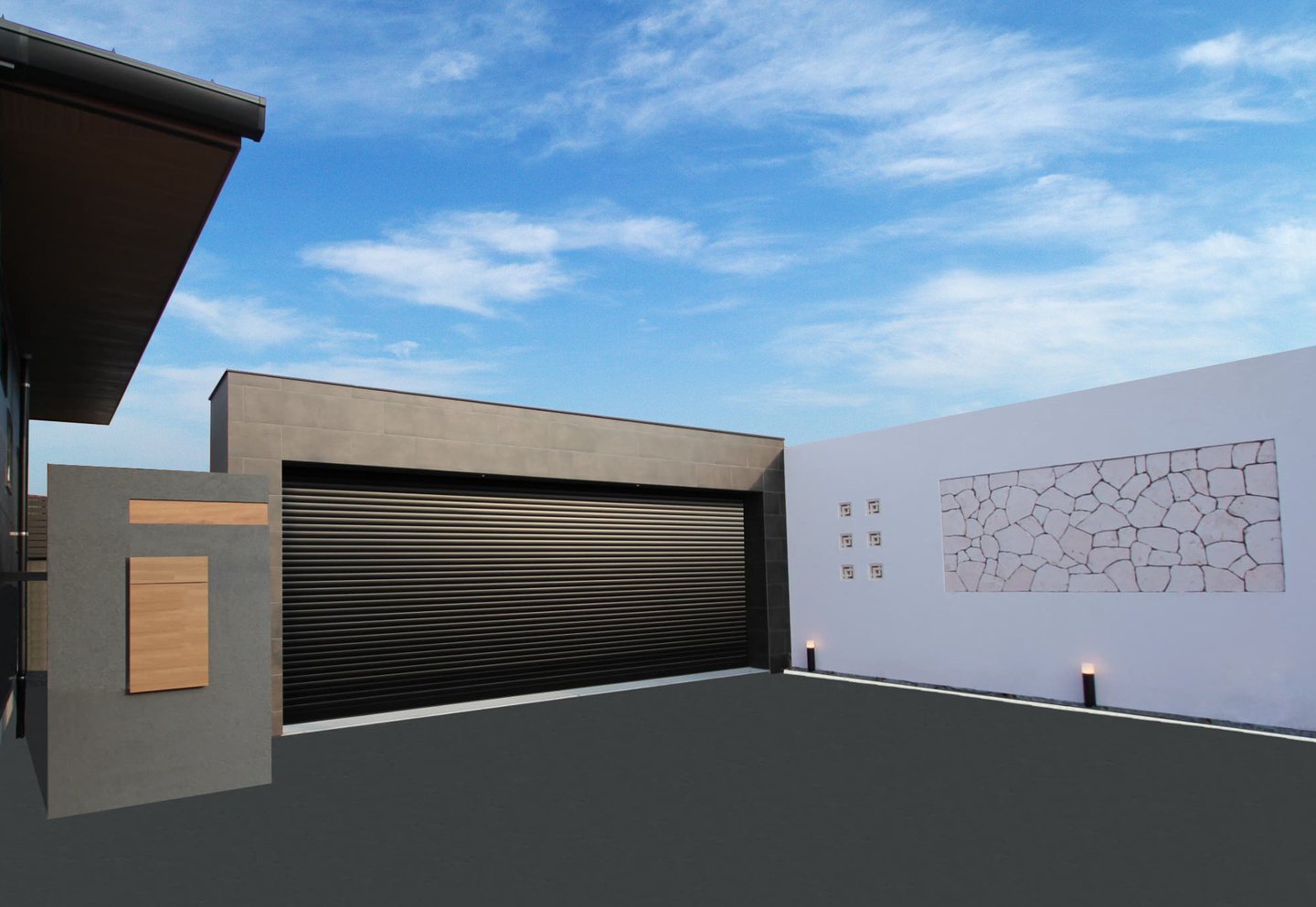 塀と埋込ポスト部分のグランドアートウォールはGAWカラー仕上げでシャッタゲートはタイルを張るデザインにしており黒で統一し高級感のある仕上がりになっております。